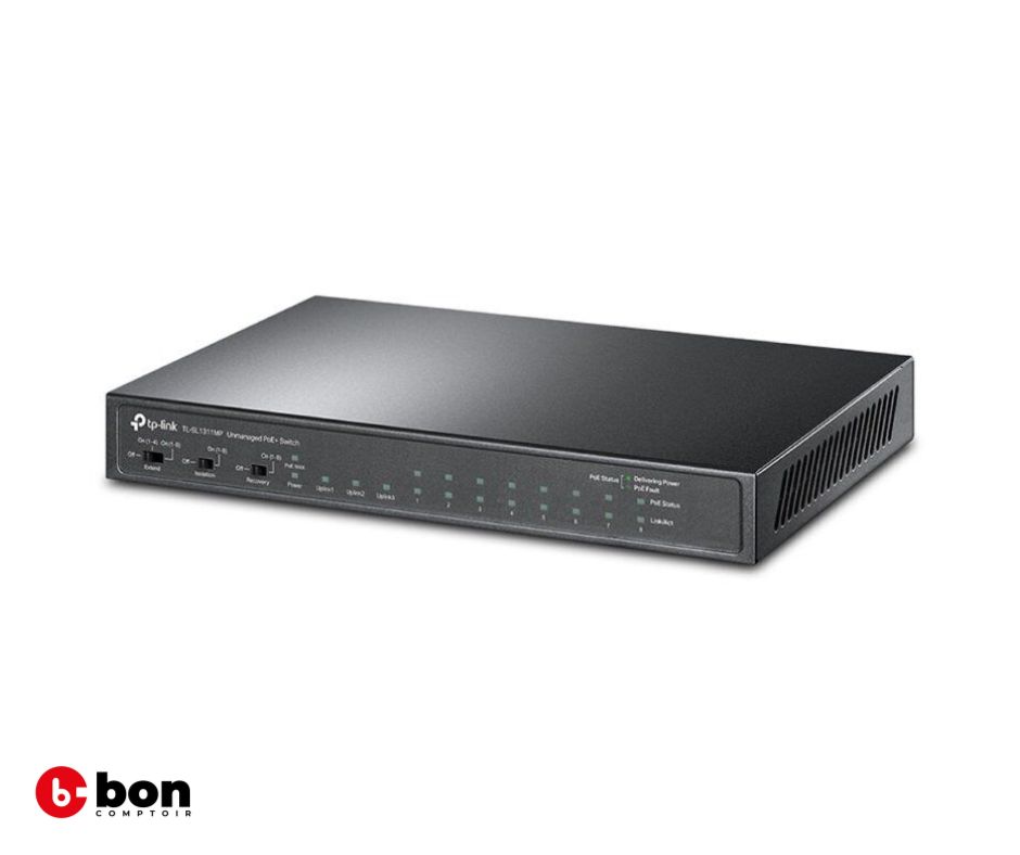 Le TP-Link TL-SL1311P est un switch de bureau polyvalent combinant 8 ports Fast Ethernet PoE+ et 3 ports Gigabit pour les connexions montantes ou les liaisons haut débit. Il permet d’alimenter jusqu’à 8 appareils compatibles PoE tels que caméras IP, téléphones VoIP ou points d’accès, avec un budget global de 124 W et il est disponible sur www.boncomptoir.com. Grâce à son fonctionnement sans configuration, il s’installe facilement et gère automatiquement la répartition de l’énergie en cas de surcharge.